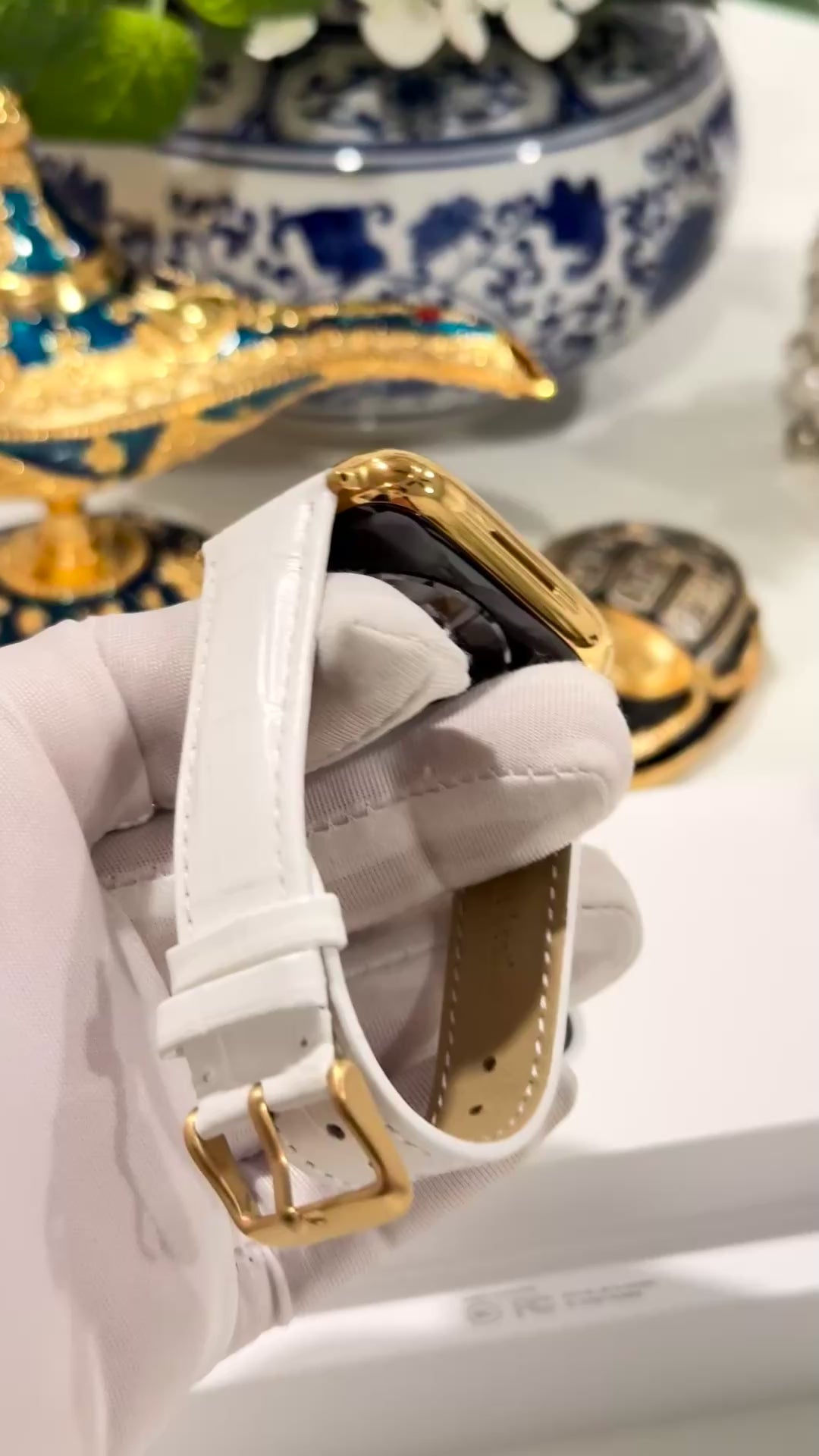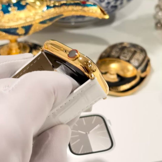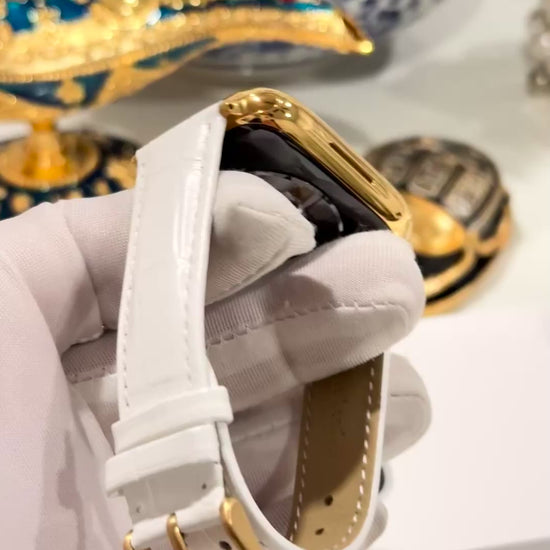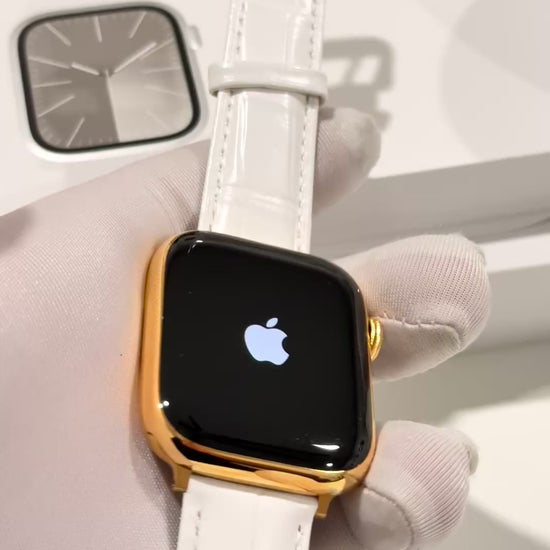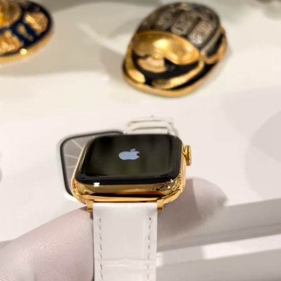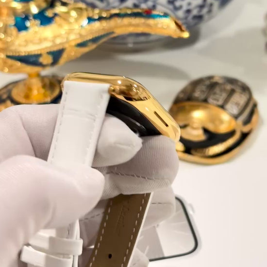 The watch is paired with a premium white leather alligator-style band, finished with a matching gold-plated buckle for a refined, cohesive look. It includes the Apple charging cable and ships in either the original Apple box or a custom wooden presentation box, depending on availability.