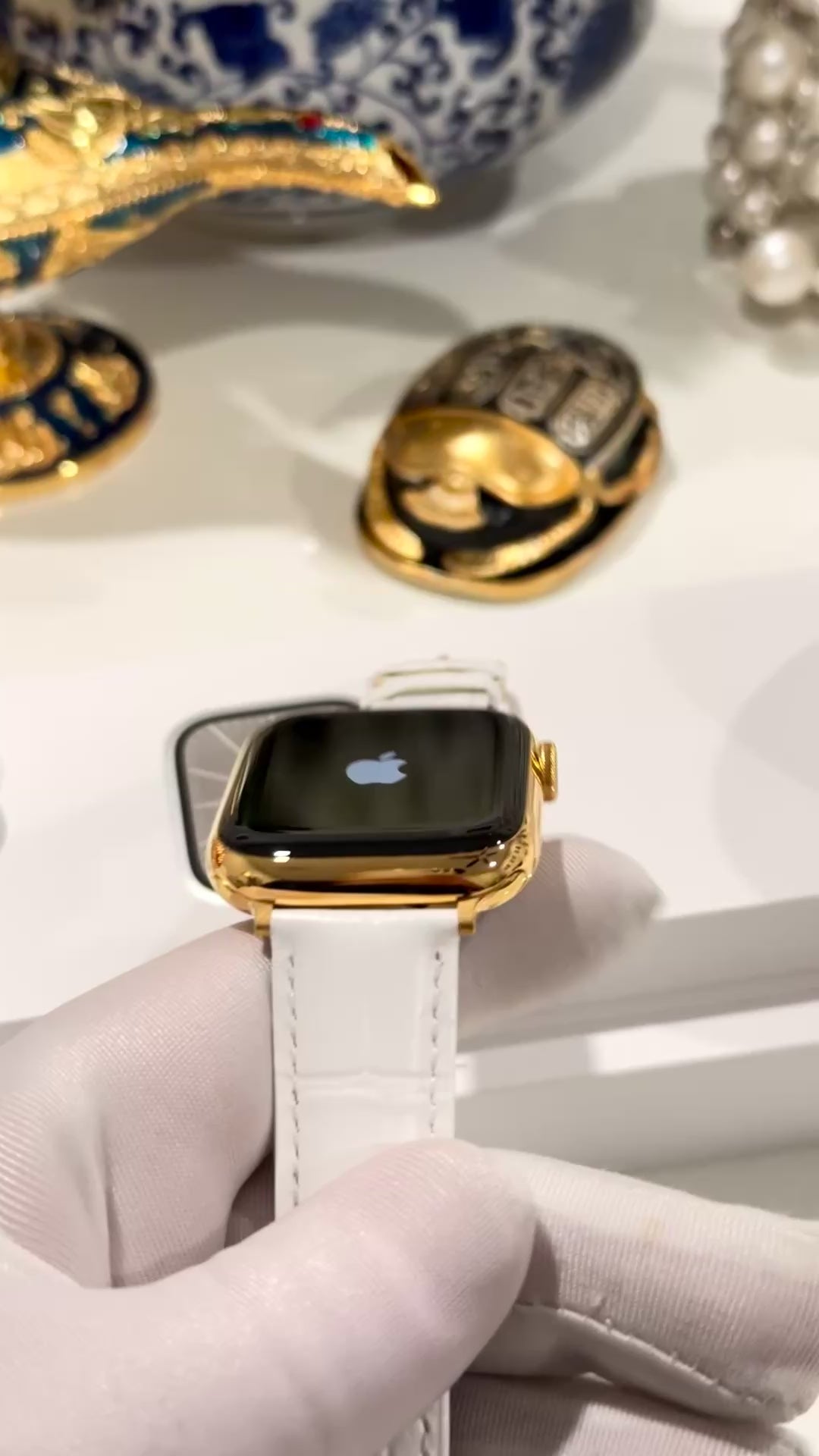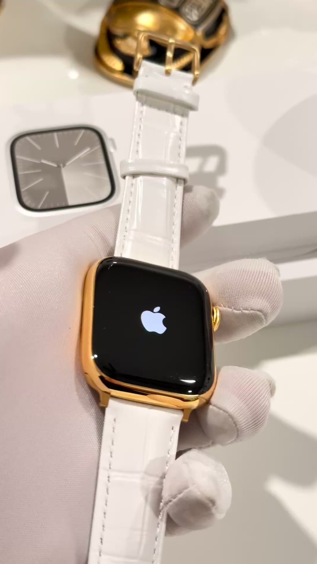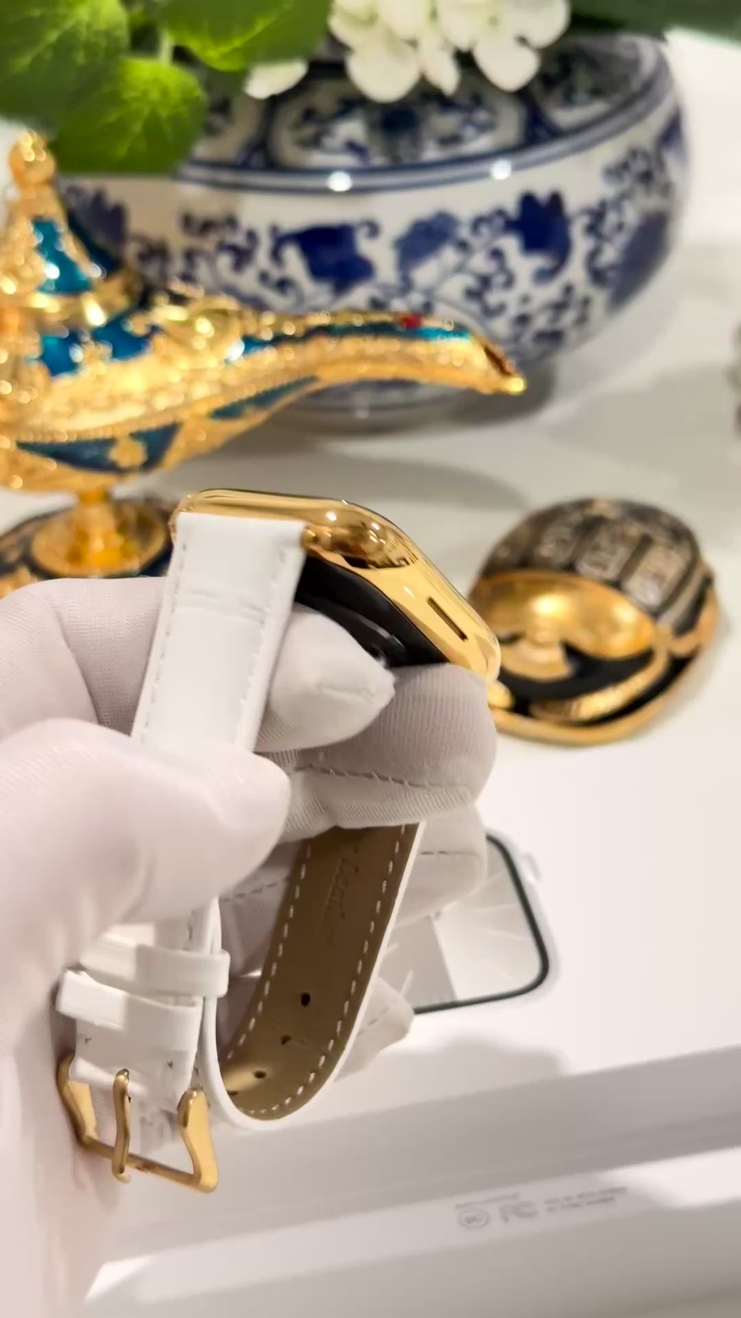 The watch is paired with a premium white leather alligator-style band, finished with a matching gold-plated buckle for a refined, cohesive look. It includes the Apple charging cable and ships in either the original Apple box or a custom wooden presentation box, depending on availability.