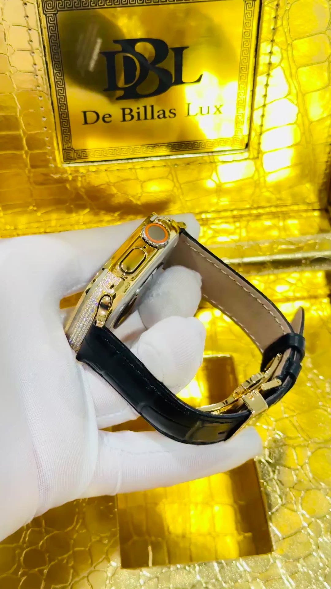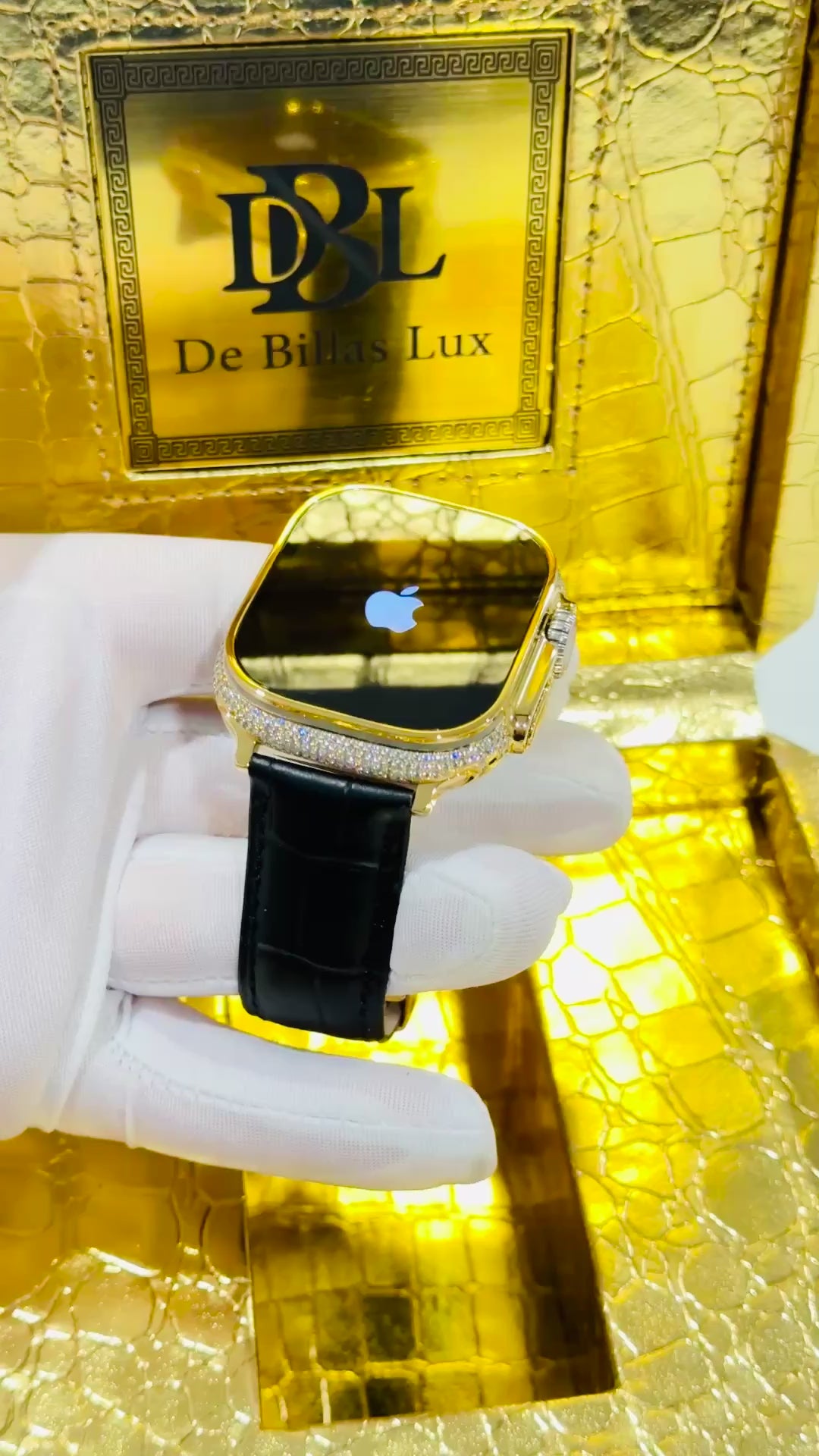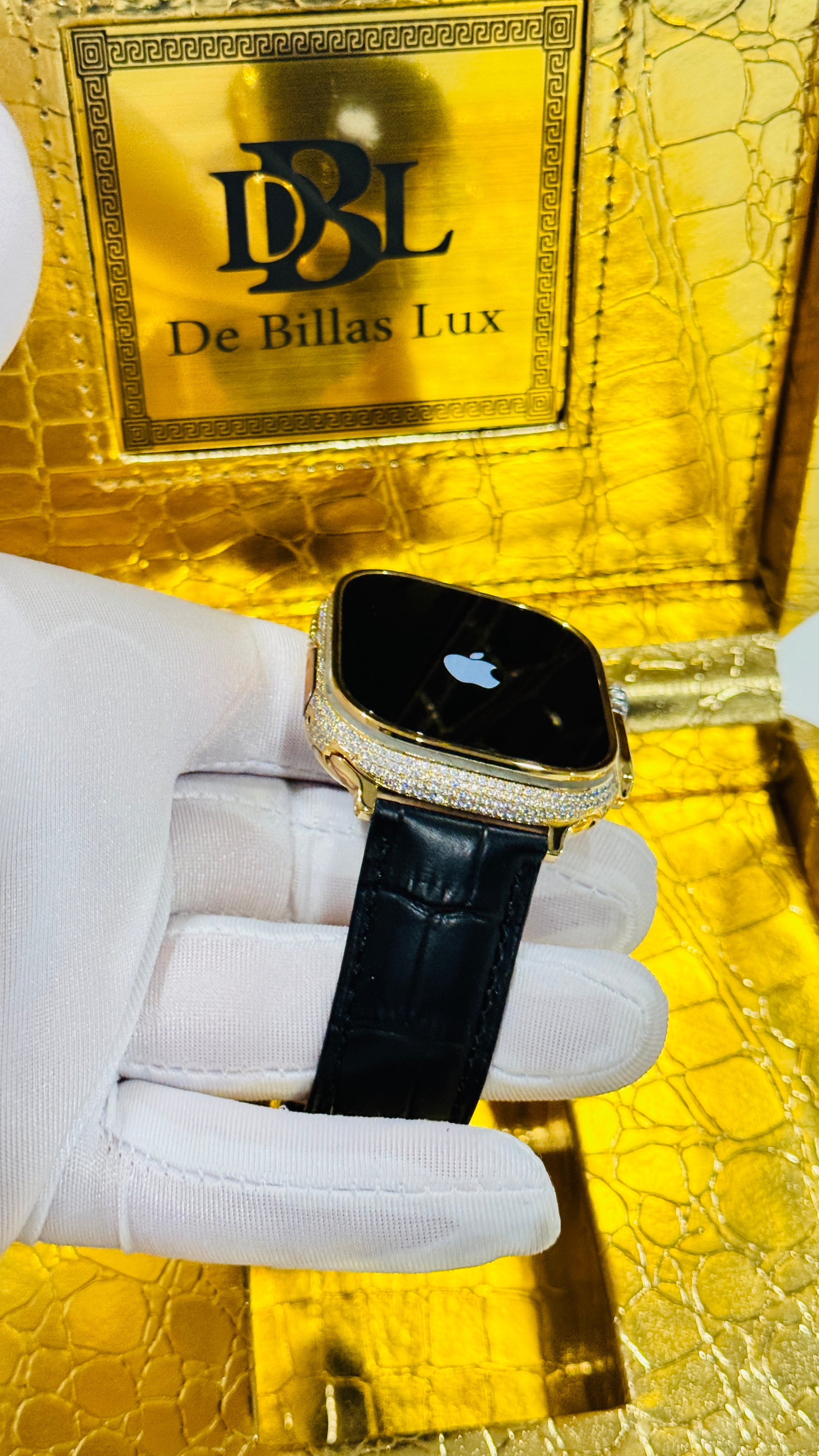 Custom 24K Gold Apple Watch Ultra 3 with Inlaid Diamonds & Black Leather Band – Luxury Gift Box Included