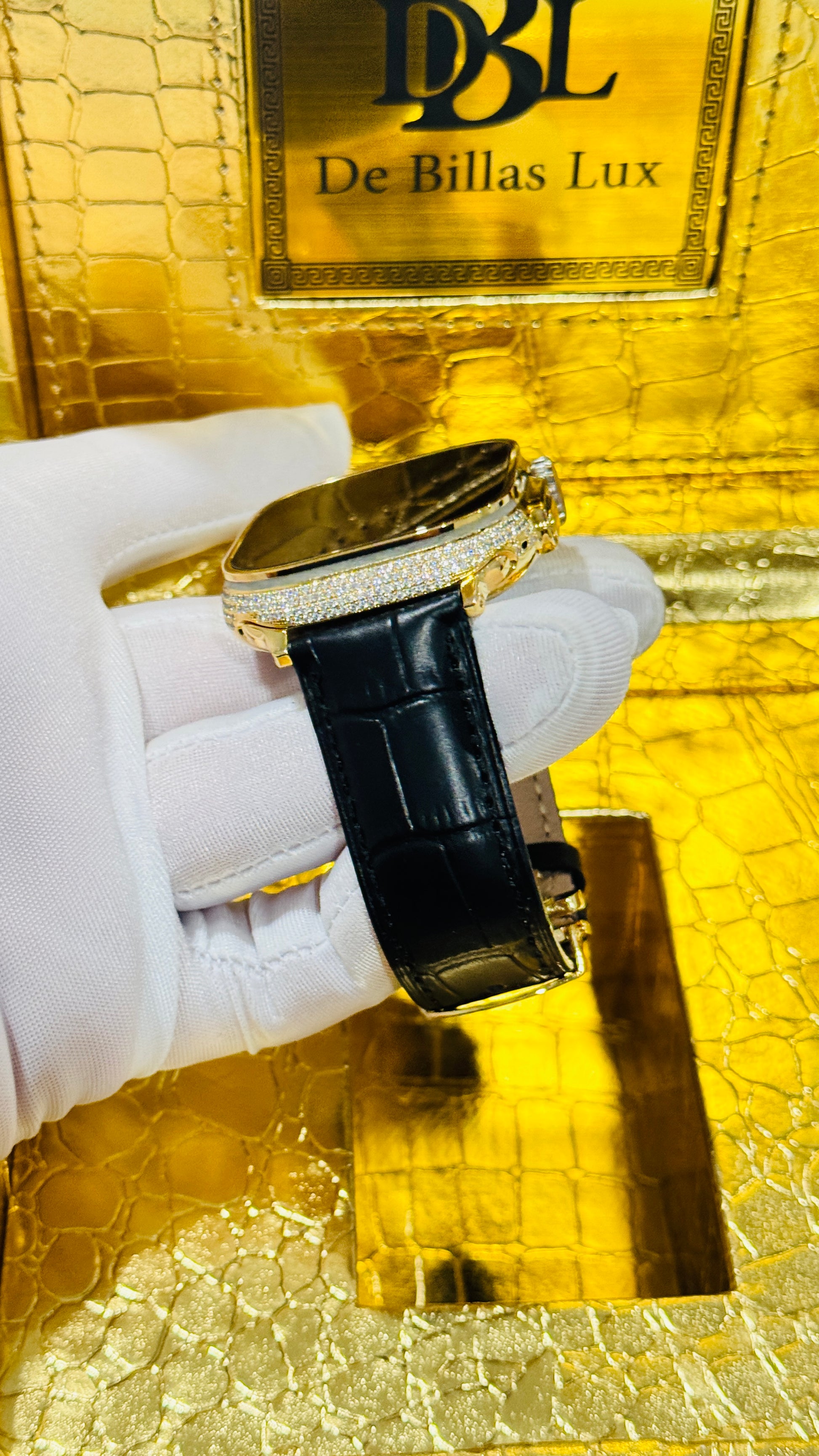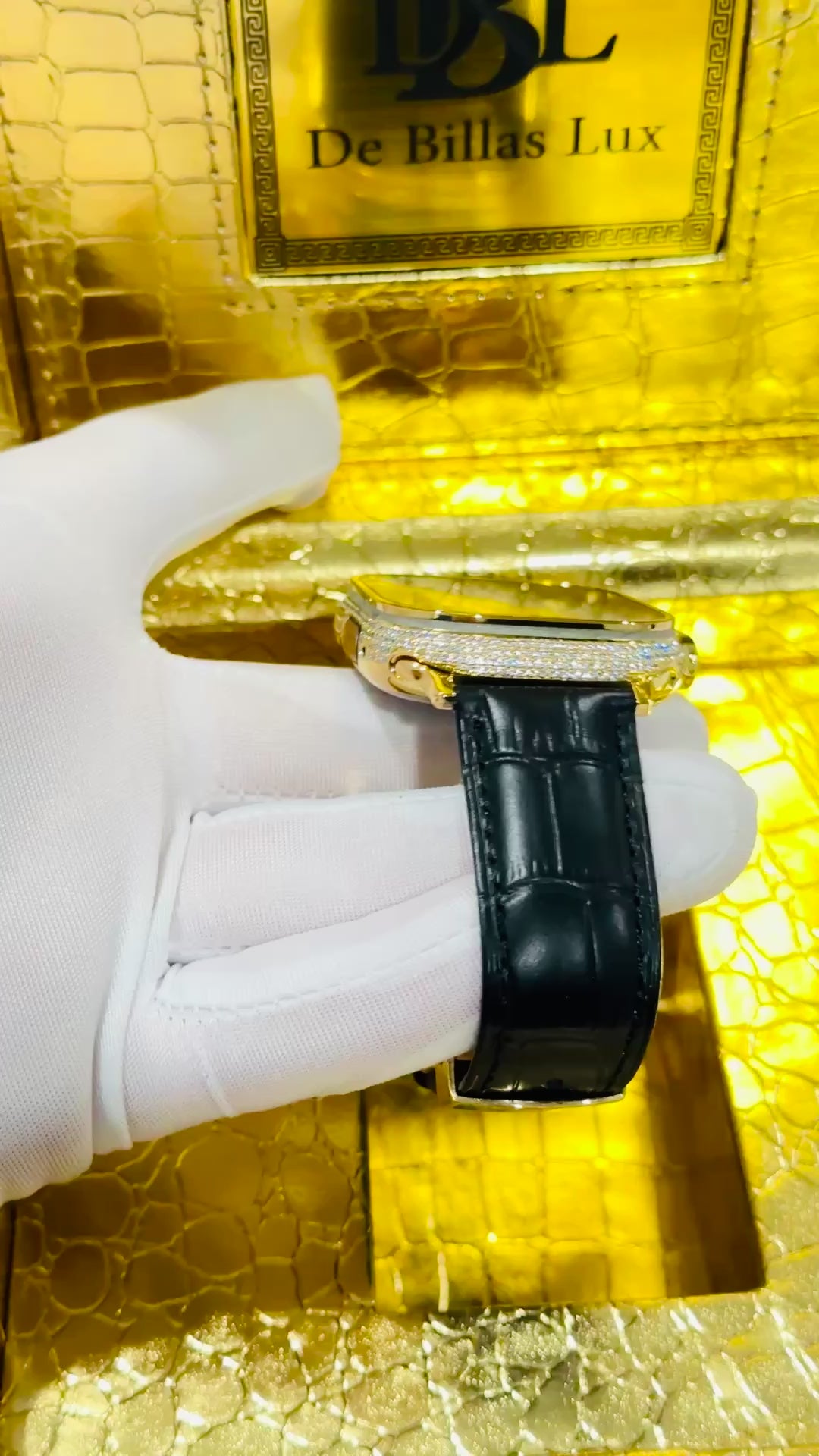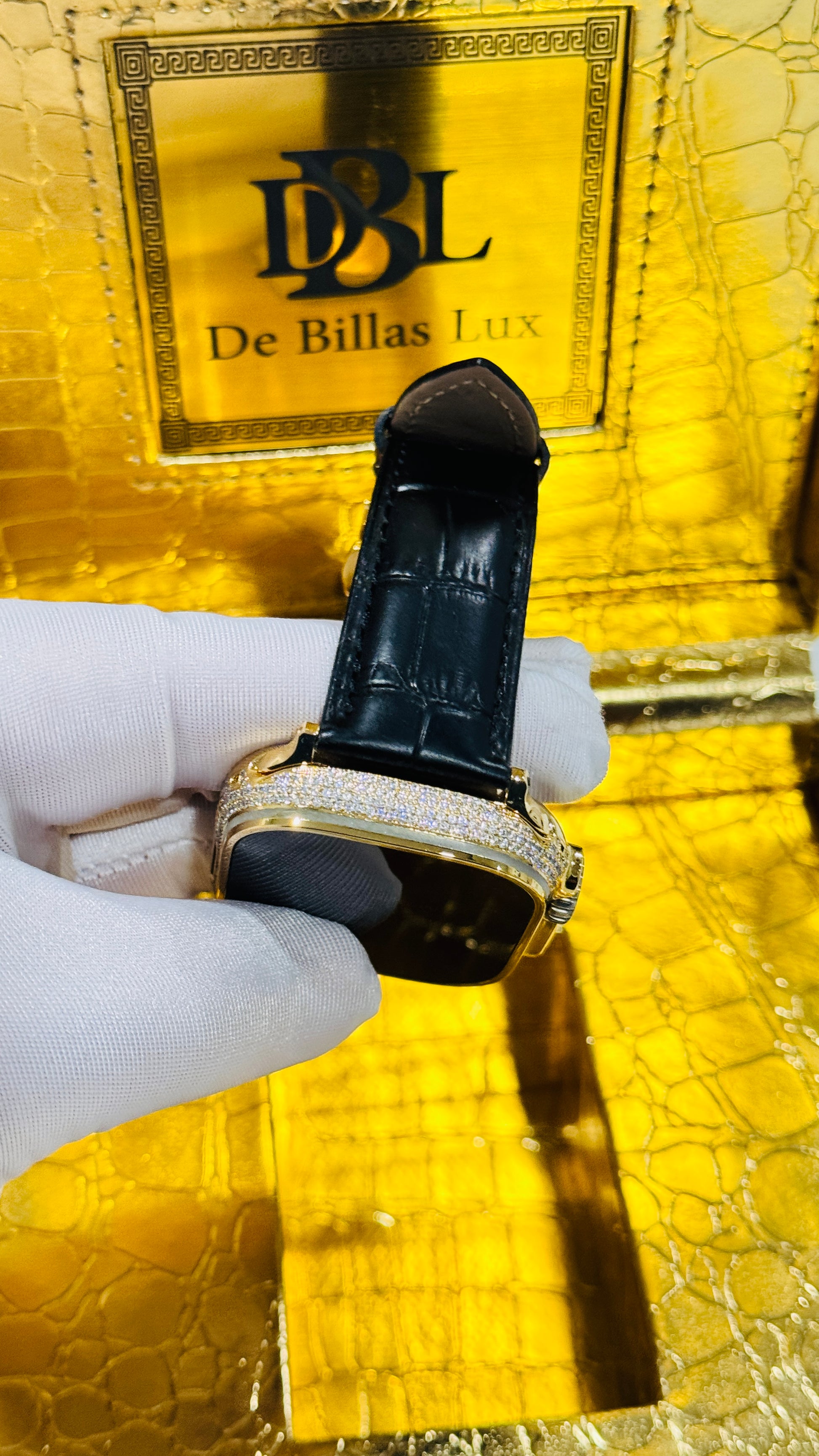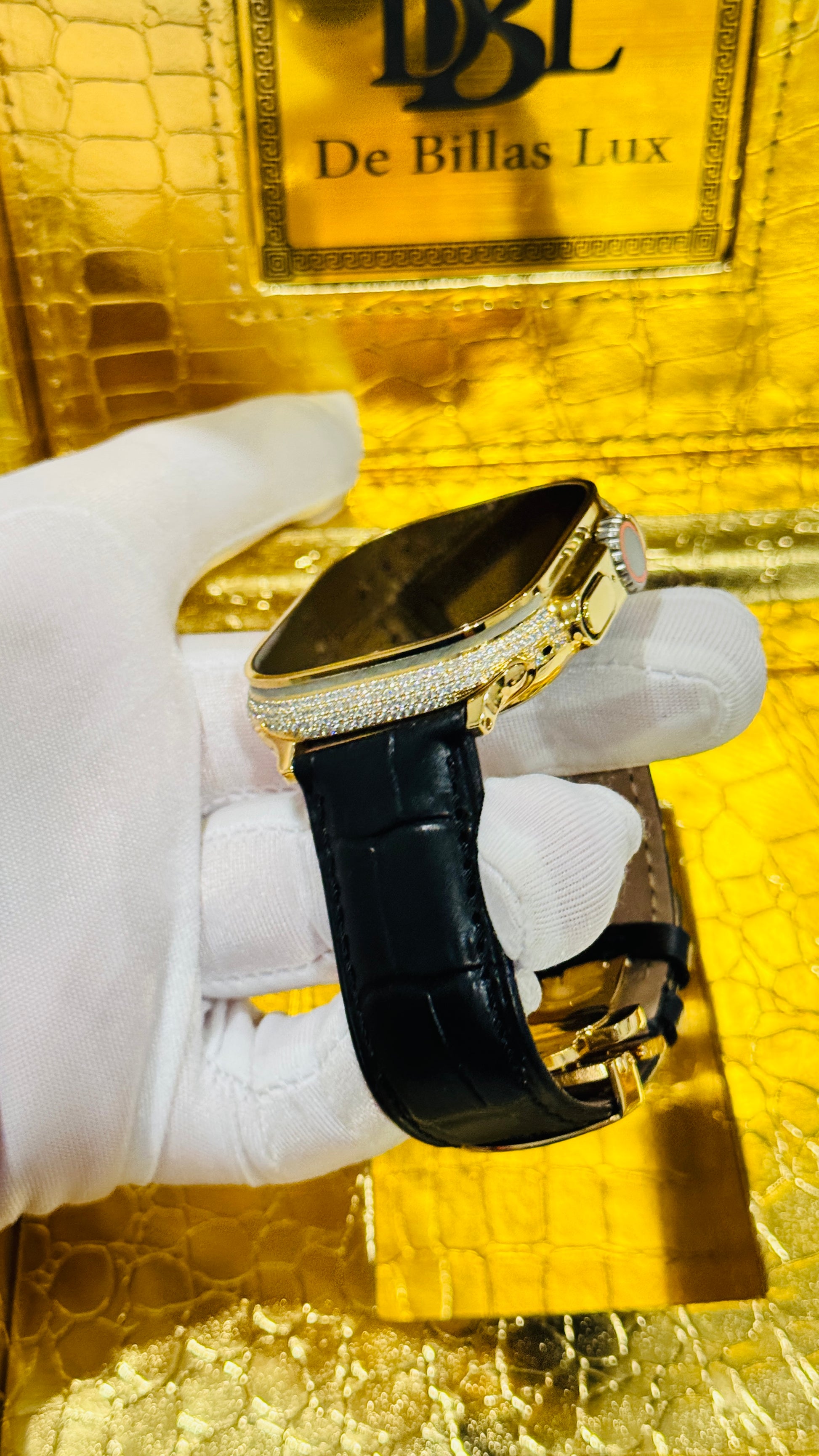 Custom 24K Gold Apple Watch Ultra 3 with Inlaid Diamonds & Black Leather Band – Luxury Gift Box Included