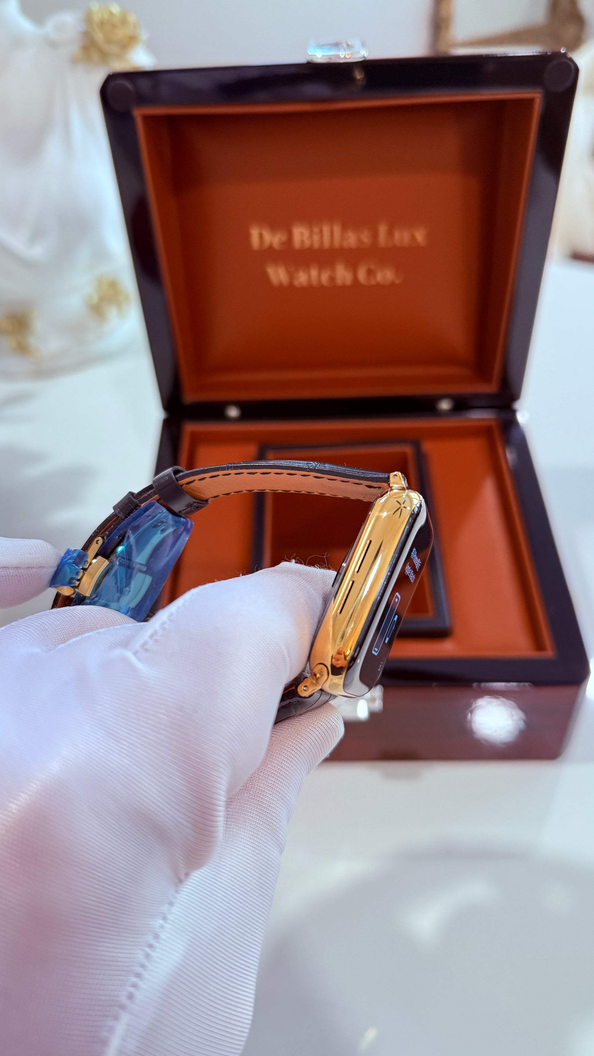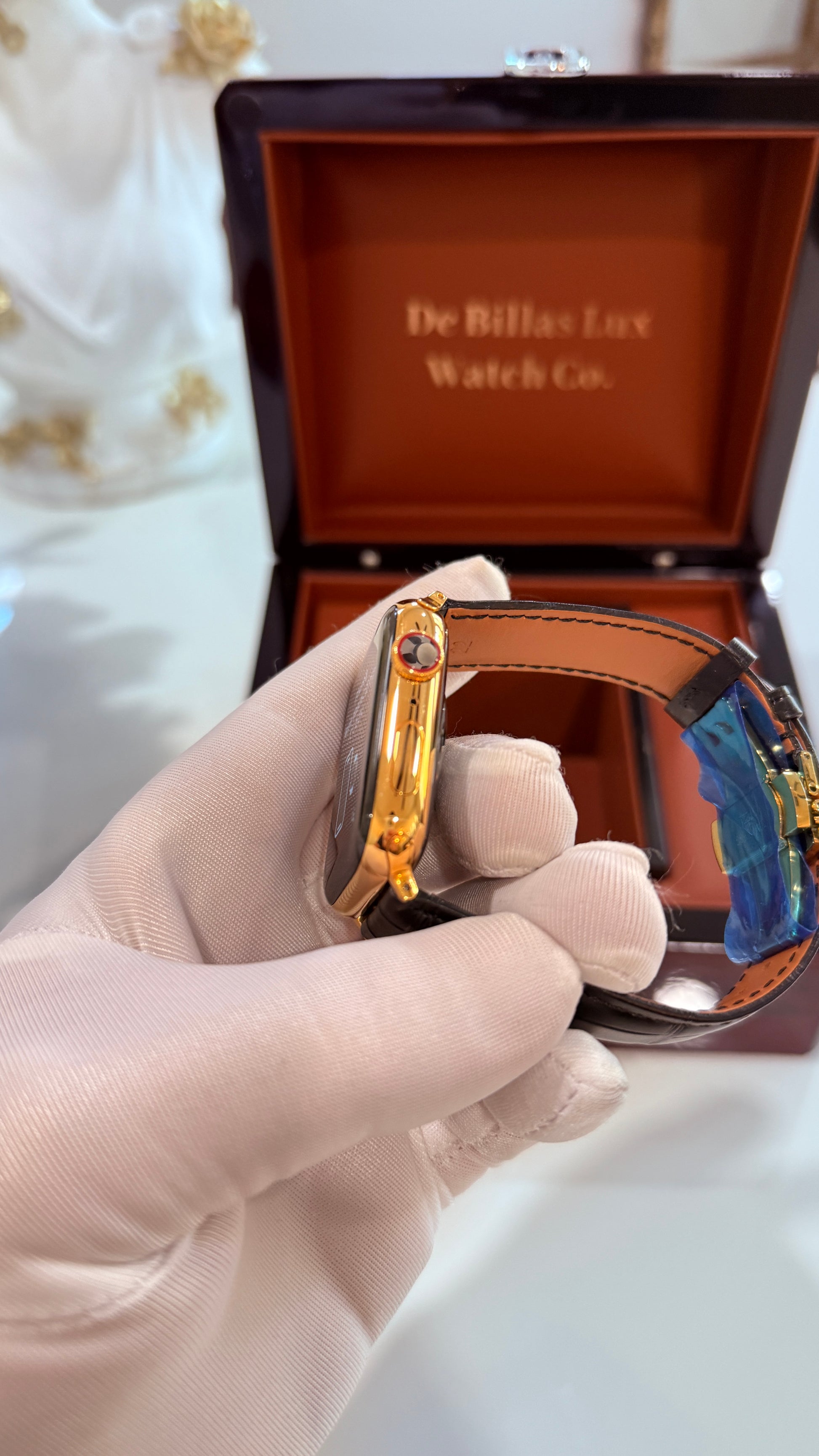 Elevate the look of your Apple Watch with this handcrafted custom black alligator leather band, paired with a stunning 24k gold-plated deployment buckle designed exclusively for those who appreciate true luxury.